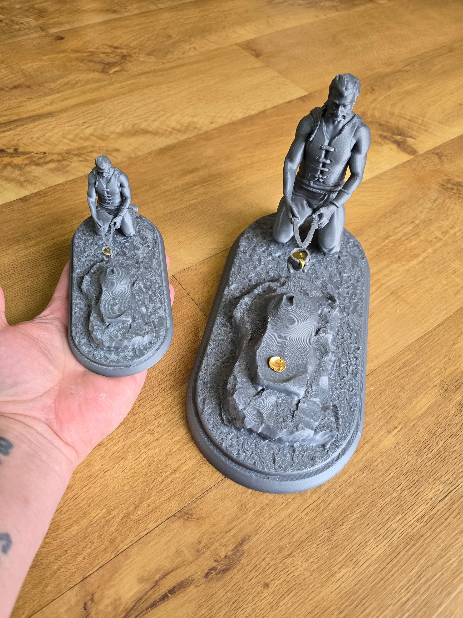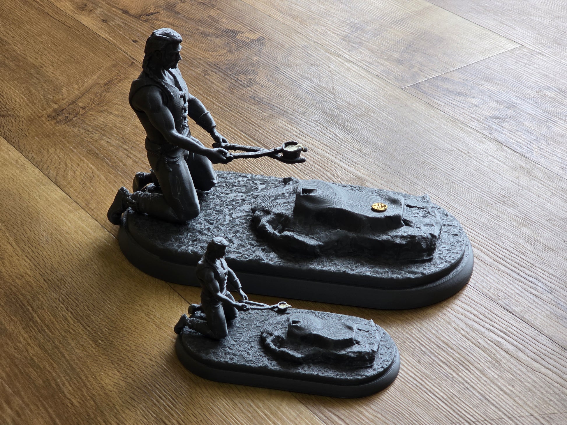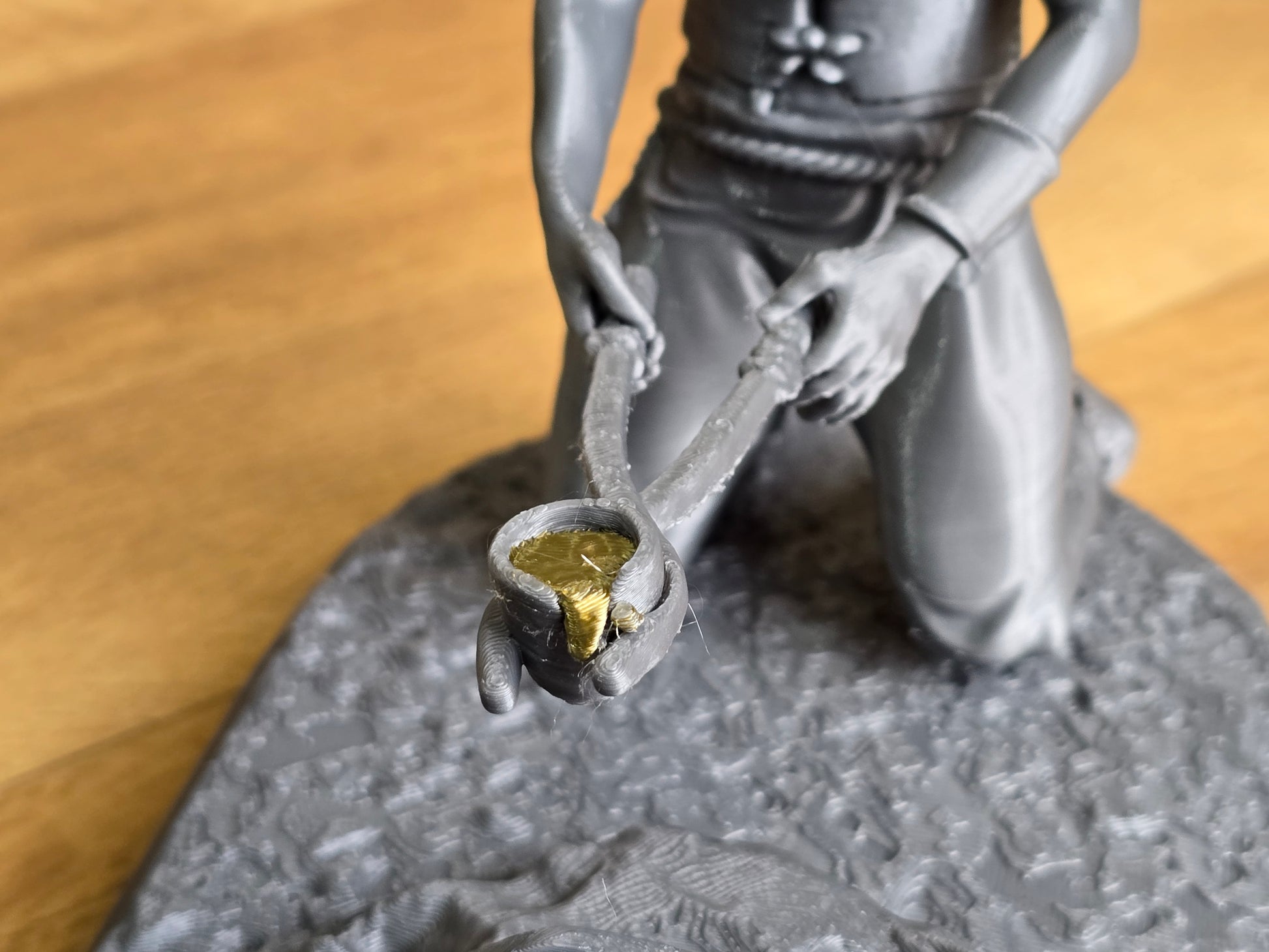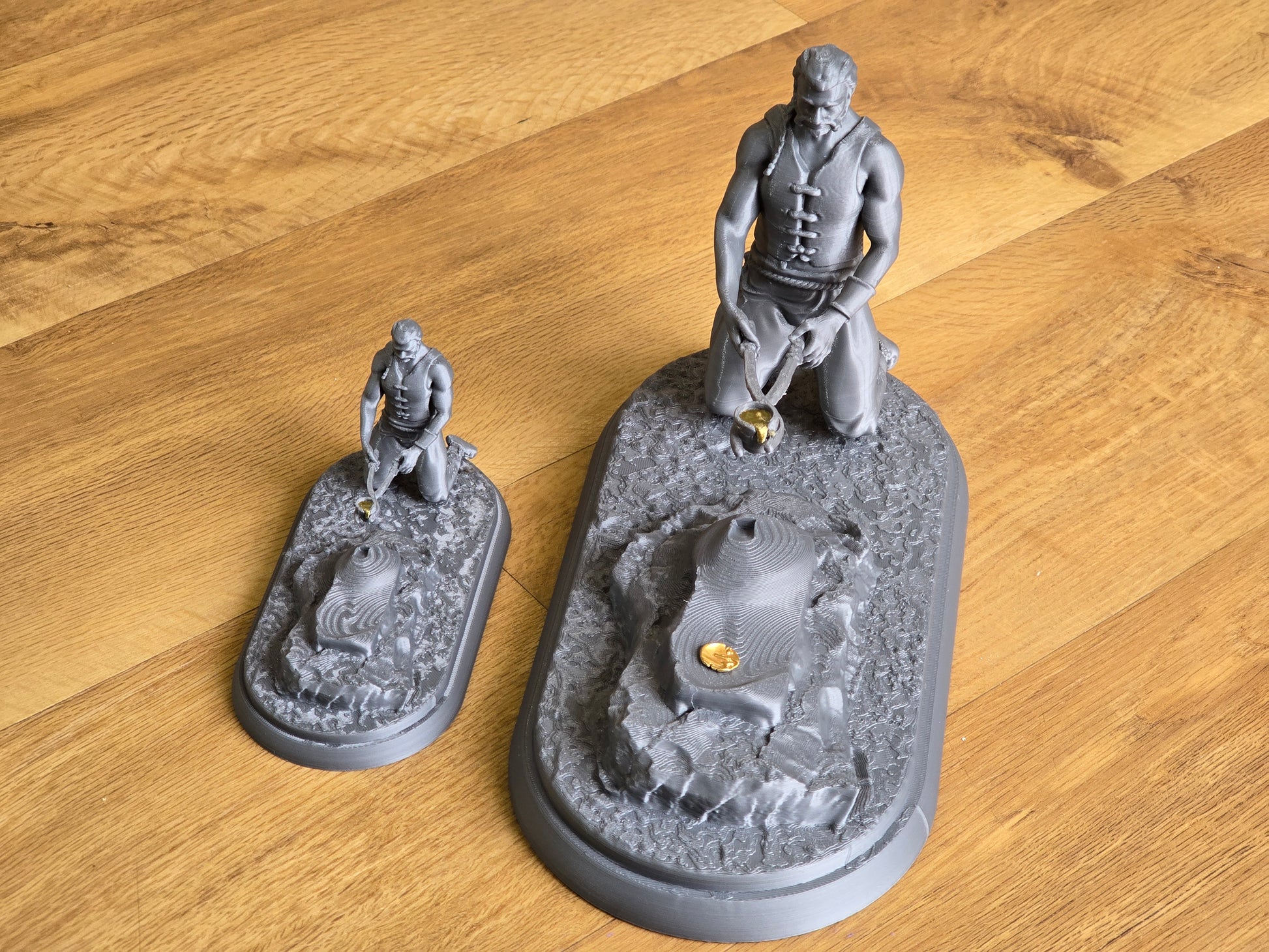 Bronze Age Blacksmith figurine, capturing the essence of an ancient craft, with intricate details as the blacksmith pours molten metal into a socketted axe head mould.