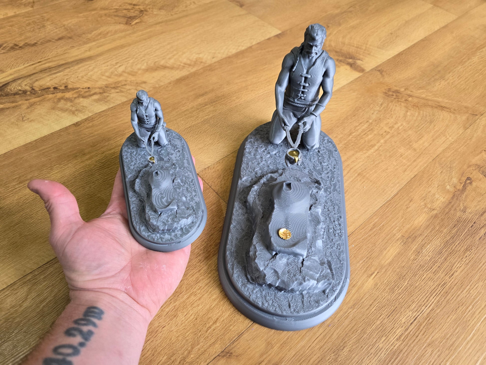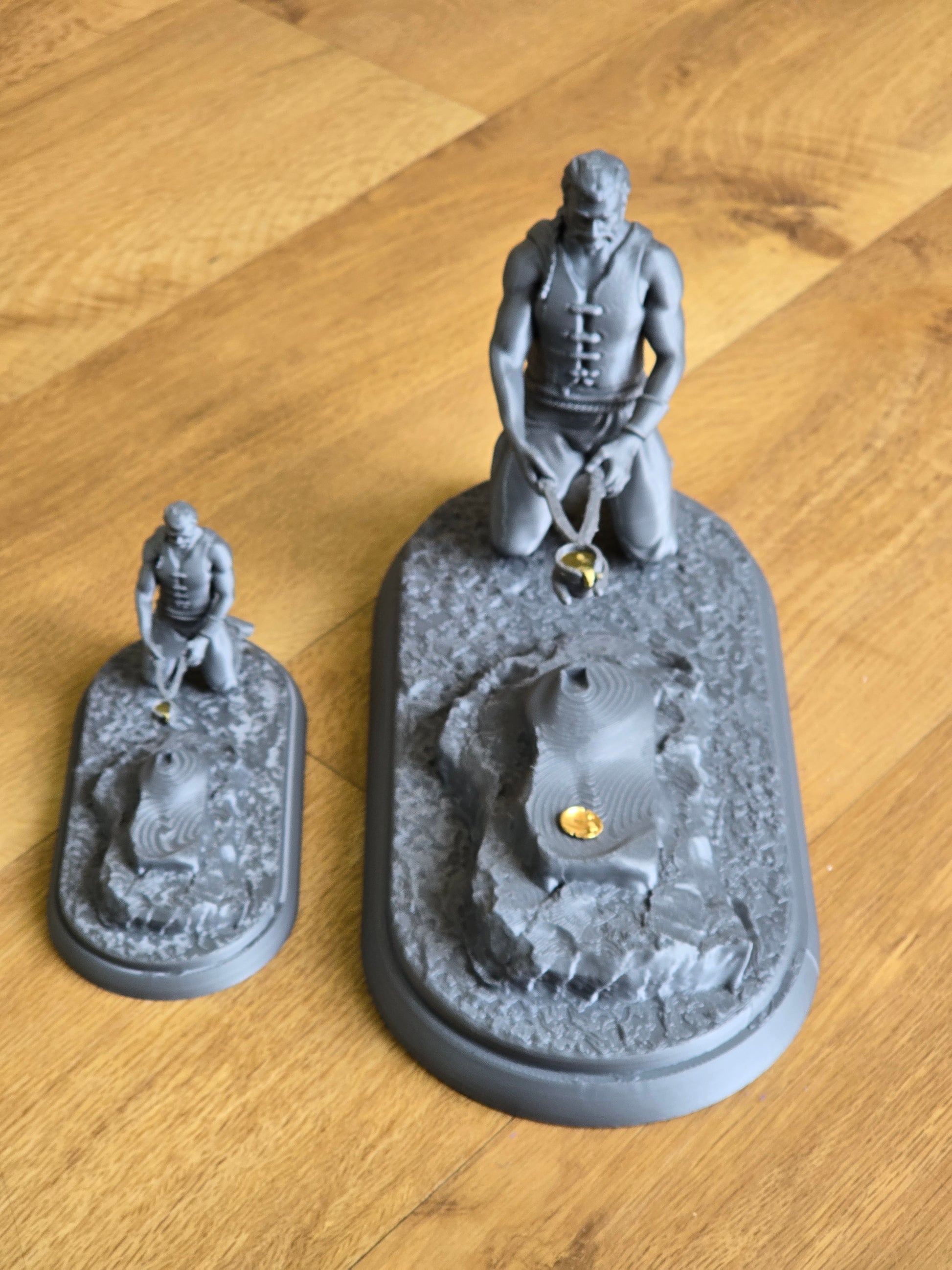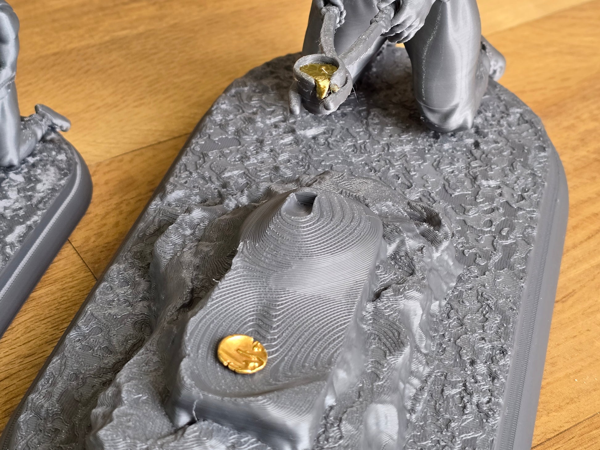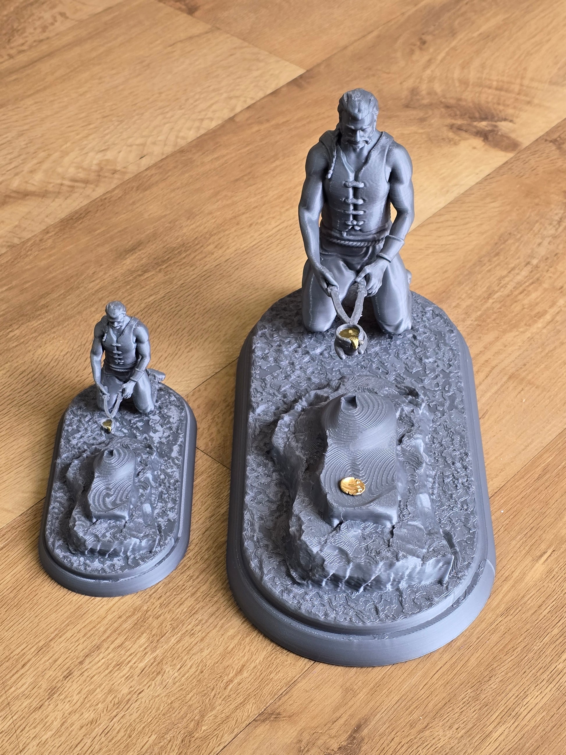 Bronze Age Blacksmith figurine, capturing the essence of an ancient craft, with intricate details as the blacksmith pours molten metal into a socketted axe head mould.