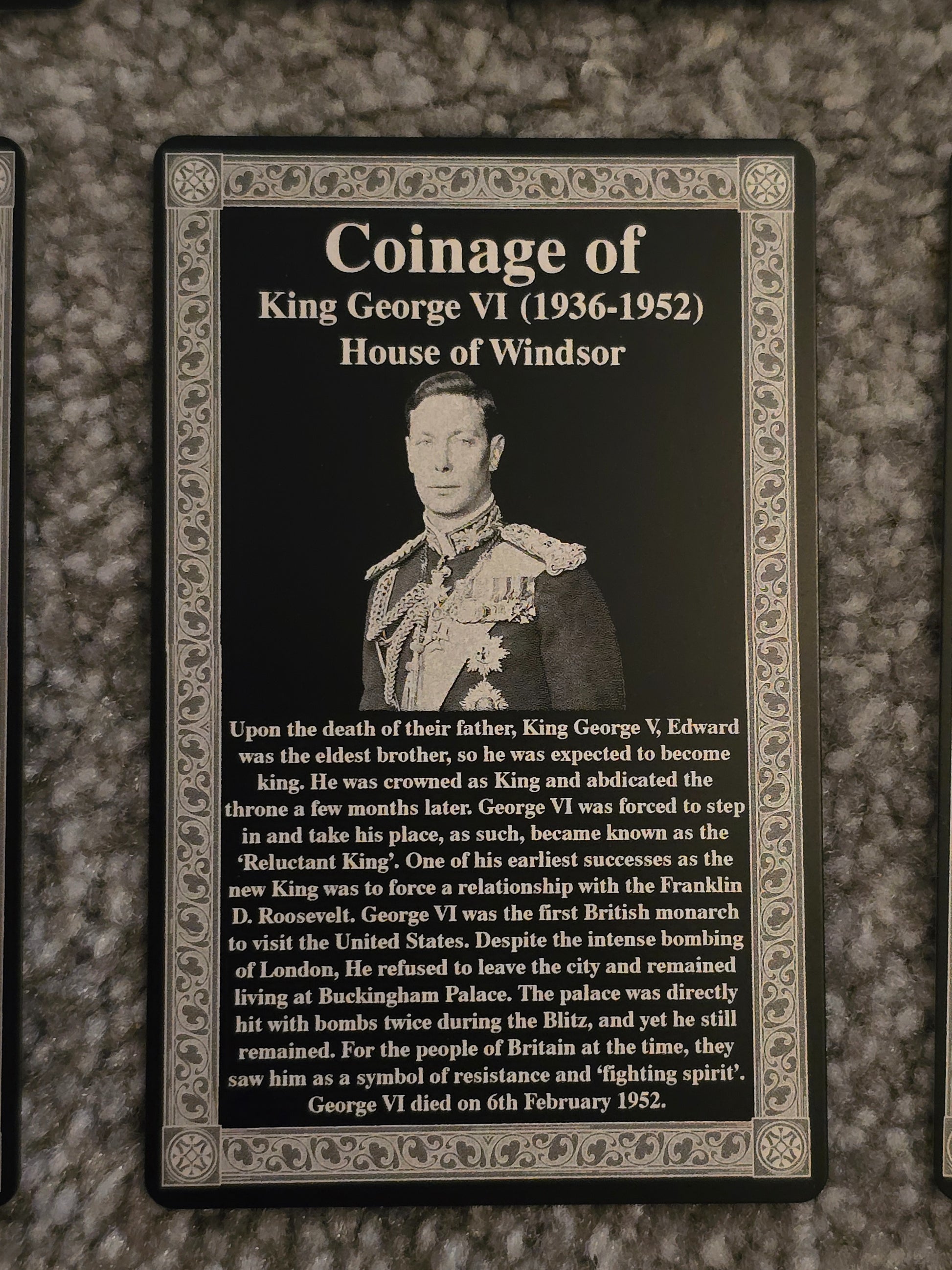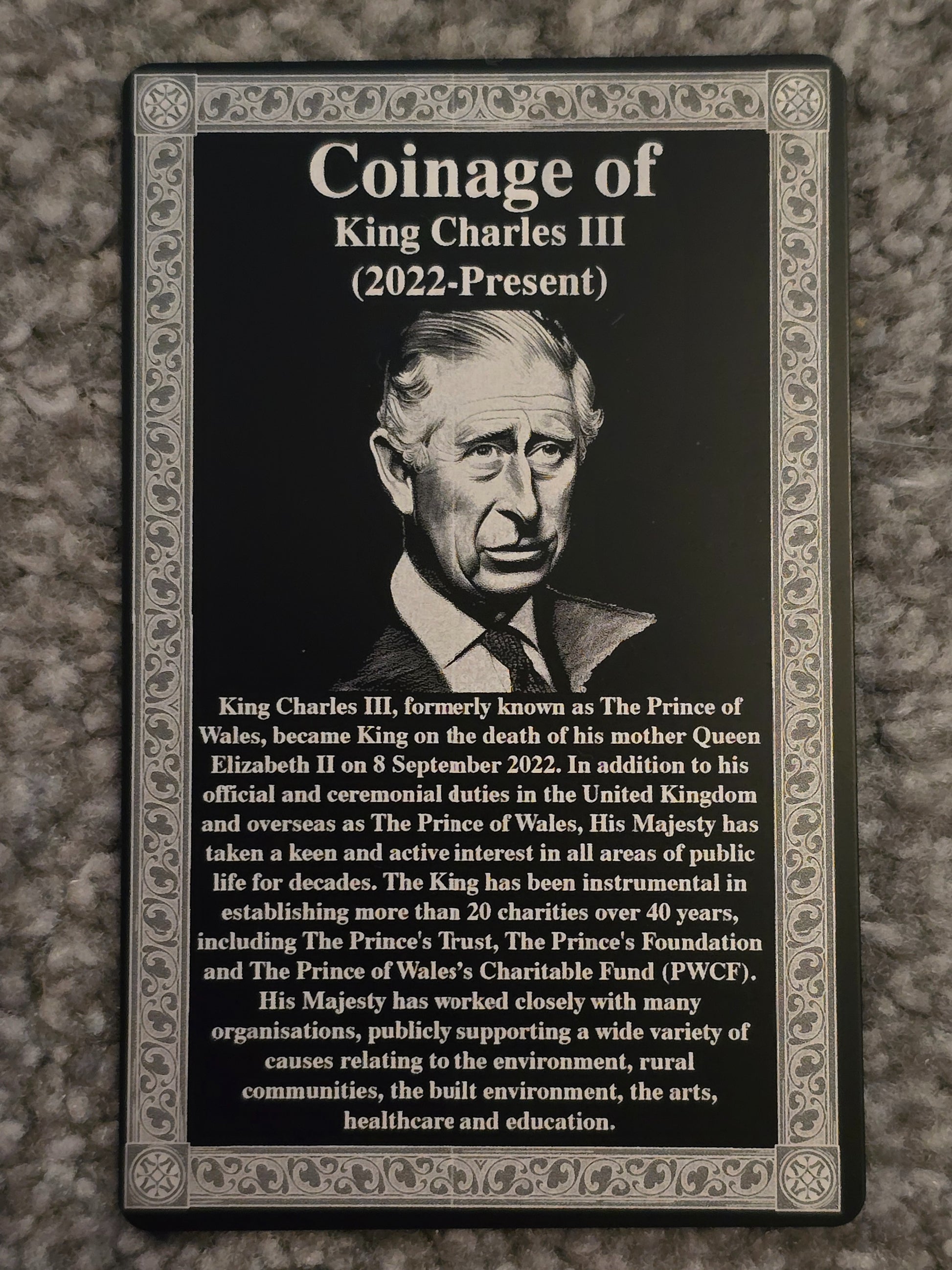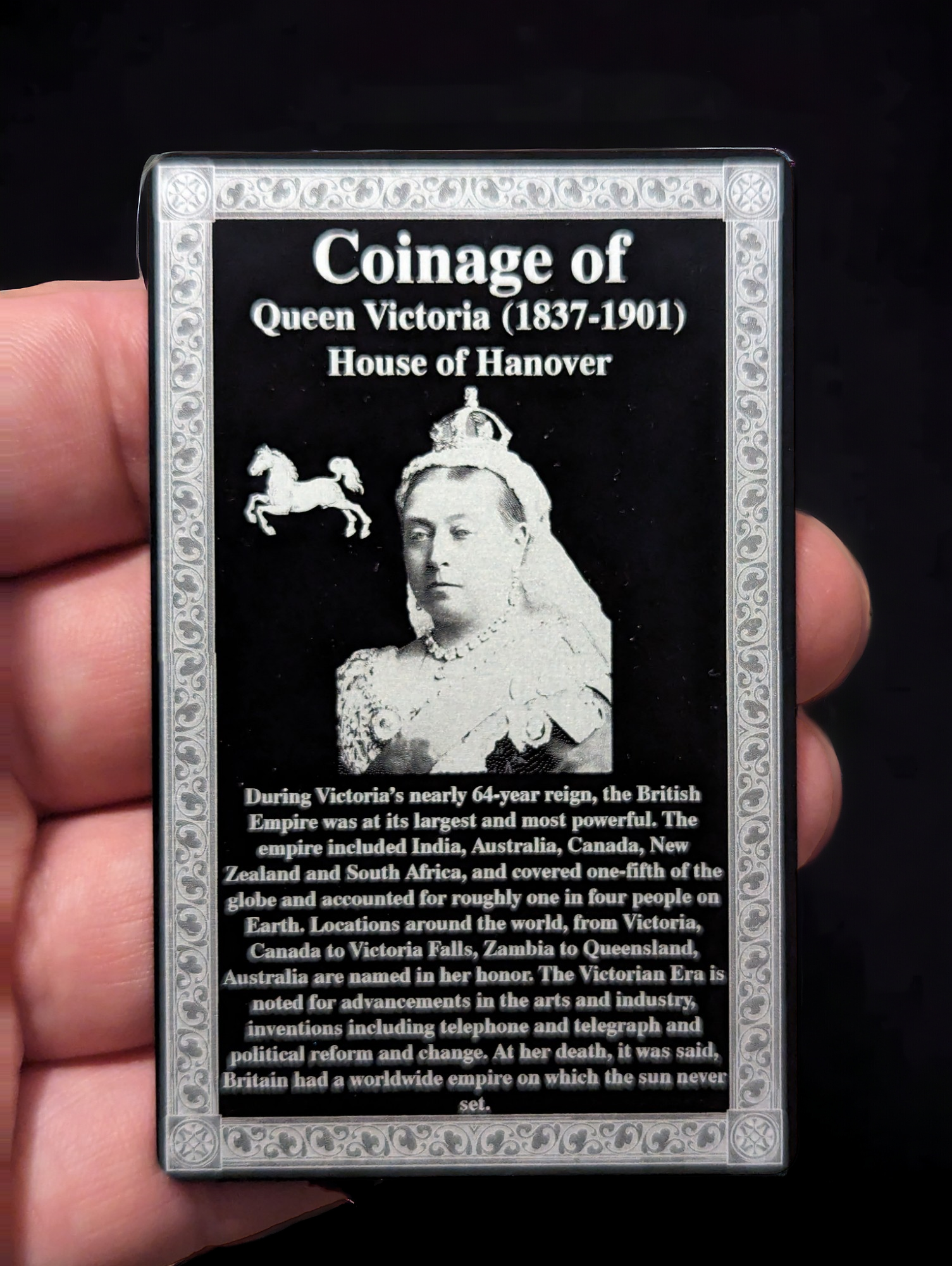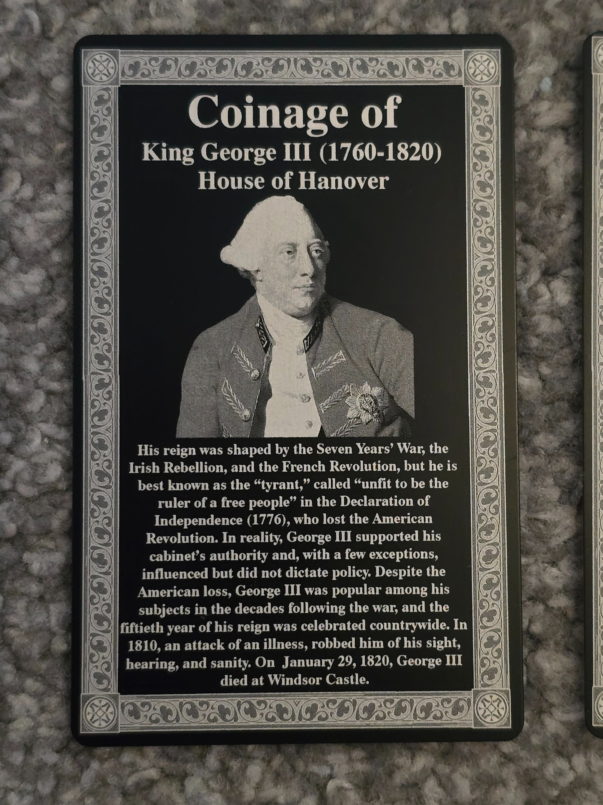 Enhance the presentation of your coin collection with our custom engraved identification cards. Each metal card features a laser-engraved design showcasing your selected monarch's details, including a concise description of their reign and life. Our collection includes a variety of monarchs, and we are constantly adding more. Don't hesitate to request a specific monarch if it is not currently available. Choose our engraved cards for a professional and informative display of your coins.