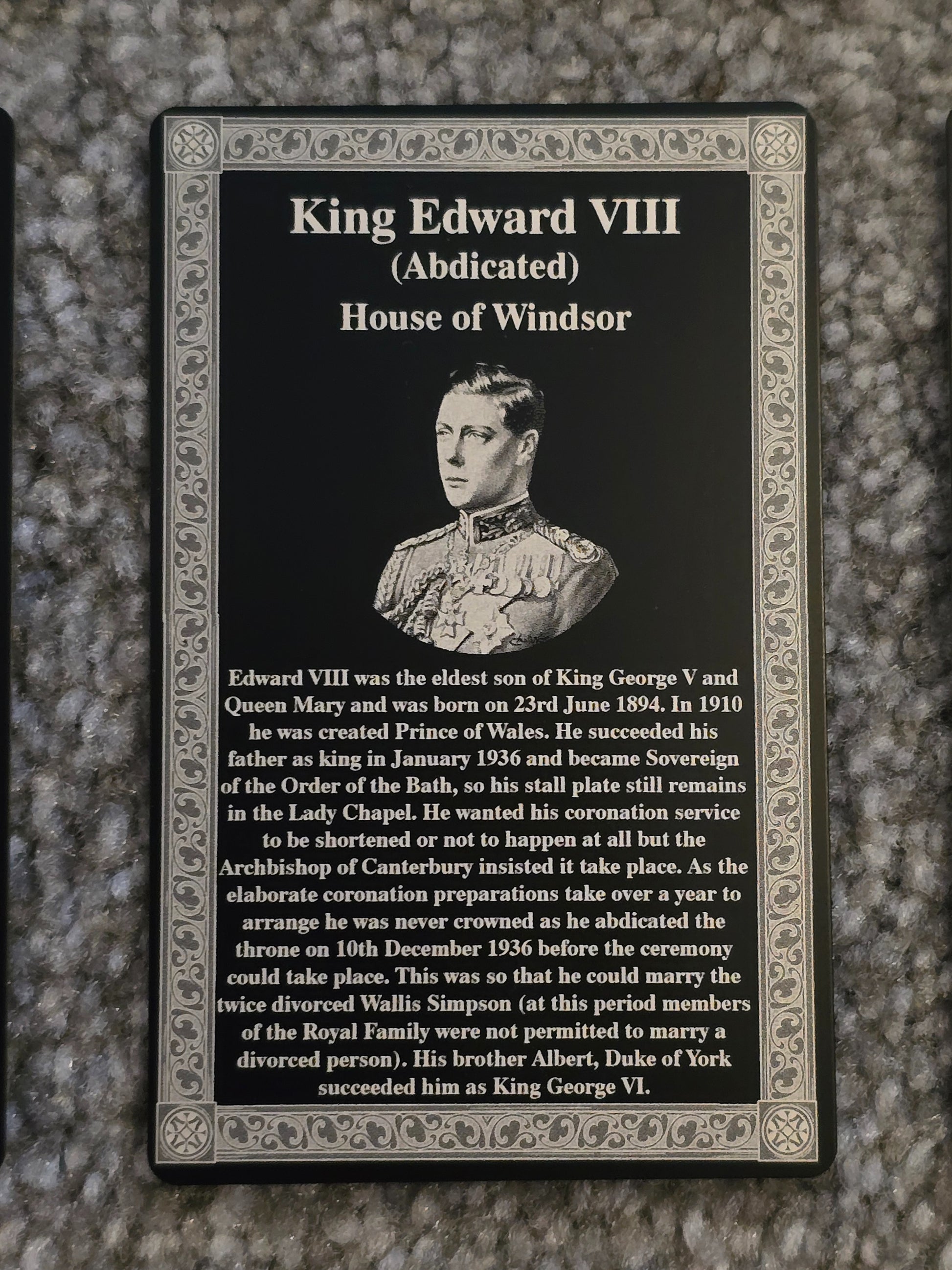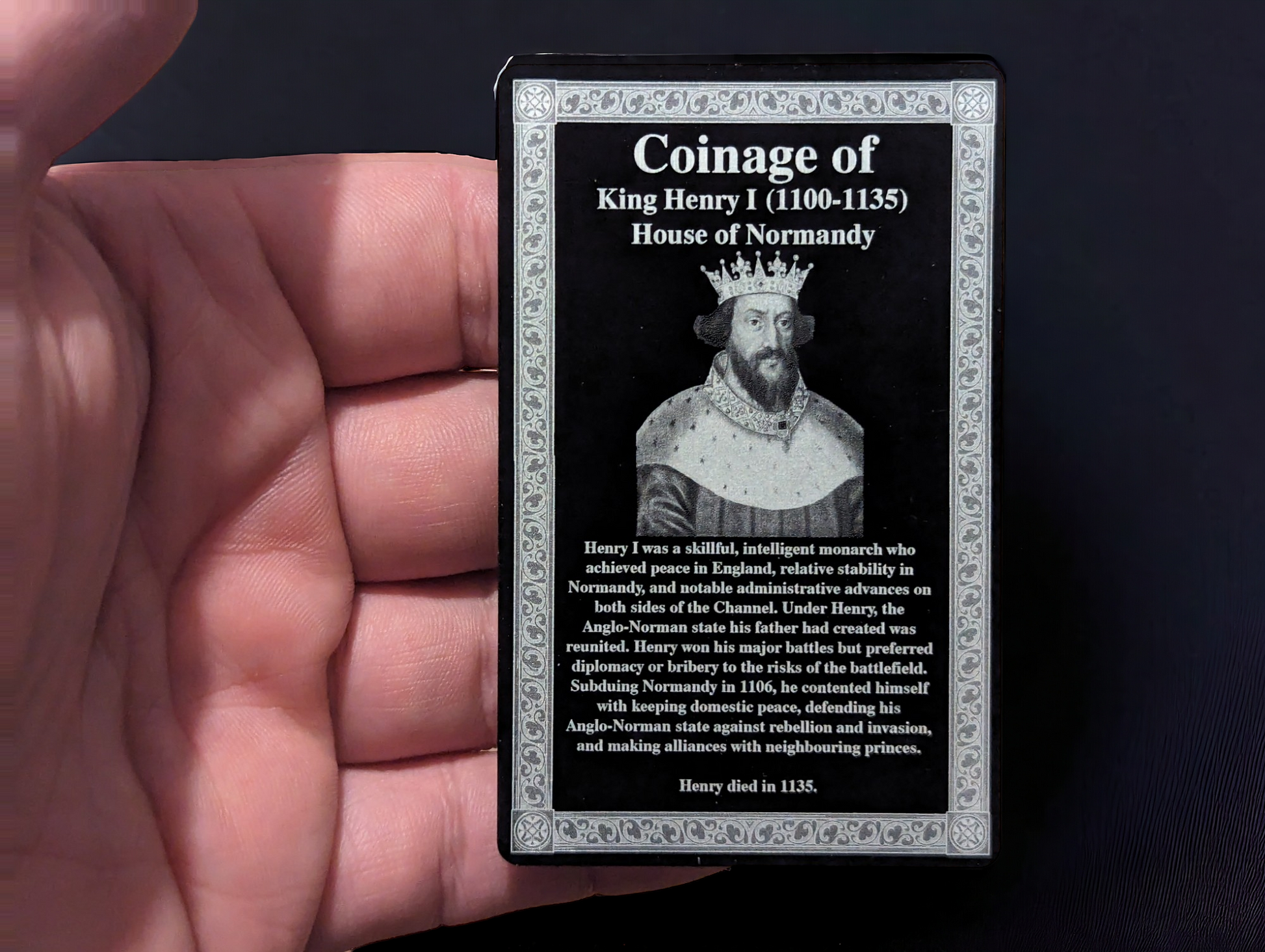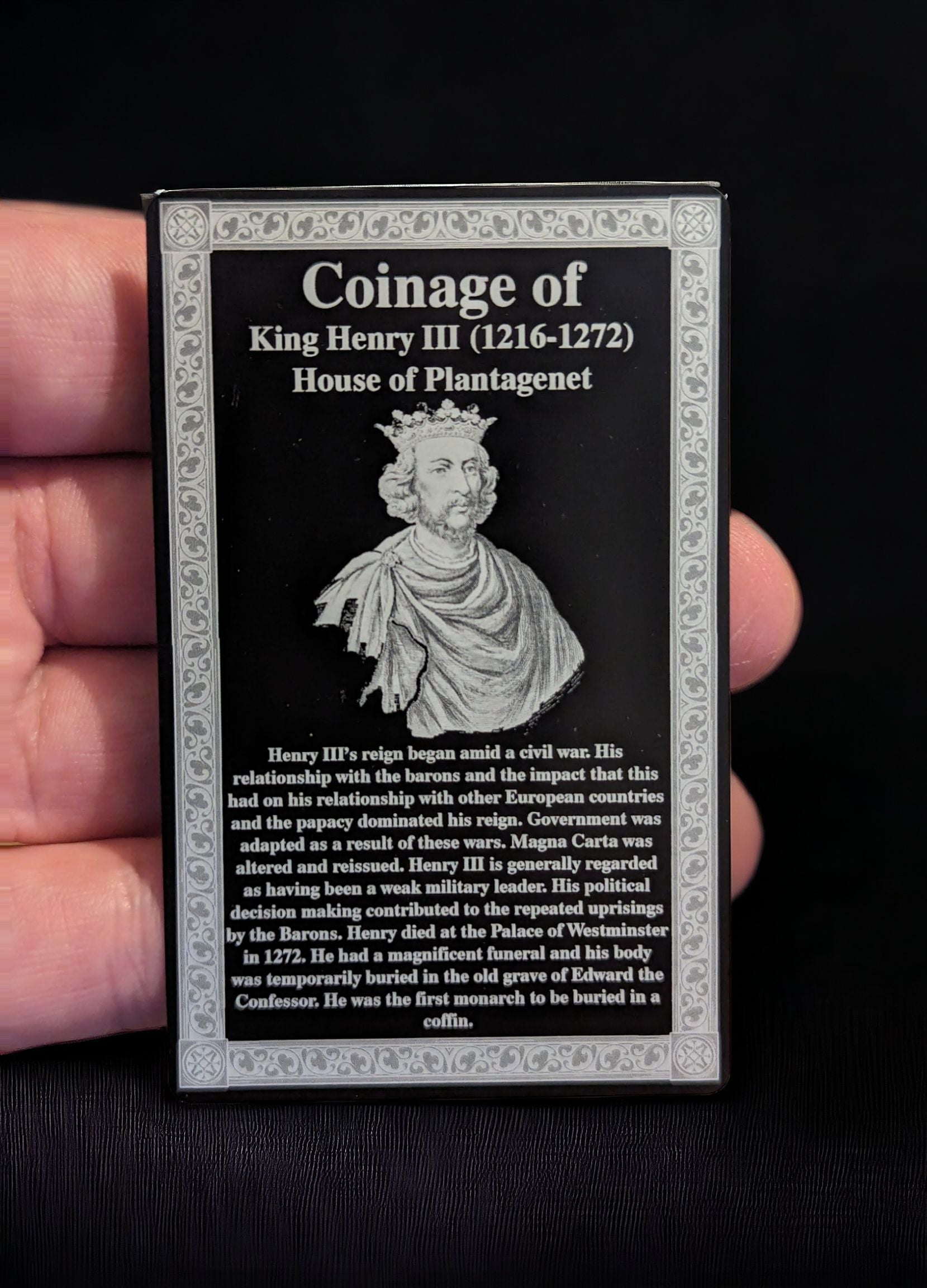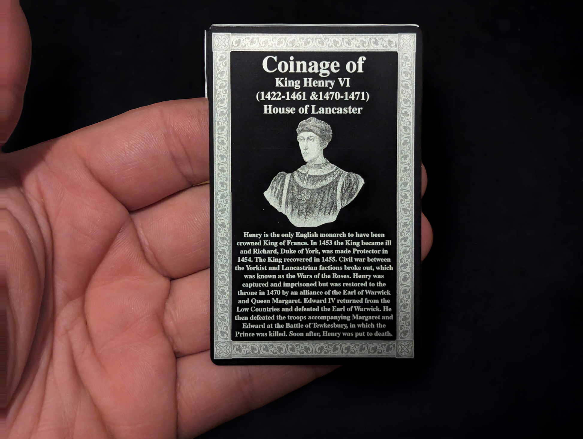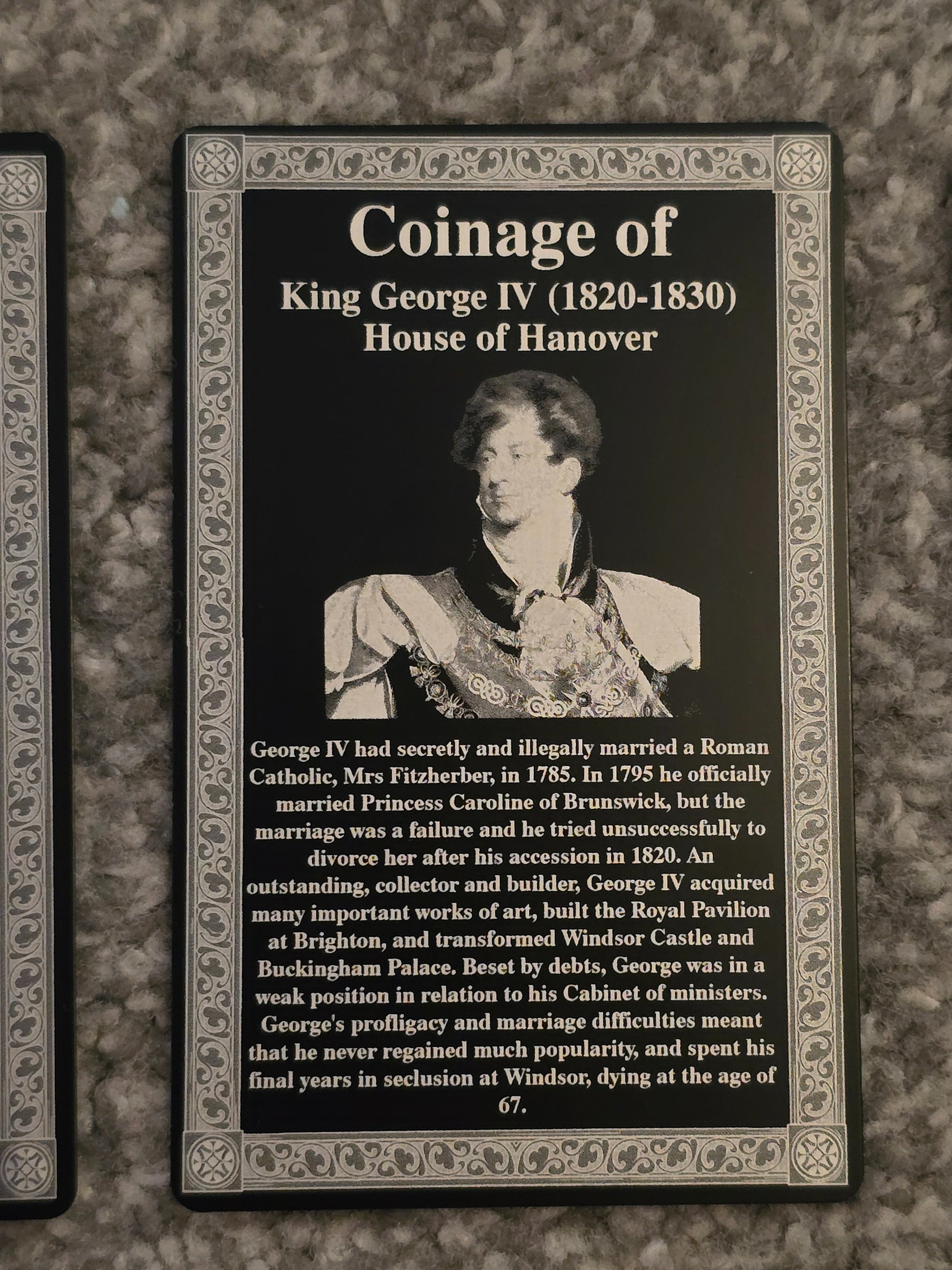 Enhance the presentation of your coin collection with our custom engraved identification cards. Each metal card features a laser-engraved design showcasing your selected monarch's details, including a concise description of their reign and life. Our collection includes a variety of monarchs, and we are constantly adding more. Don't hesitate to request a specific monarch if it is not currently available. Choose our engraved cards for a professional and informative display of your coins.
