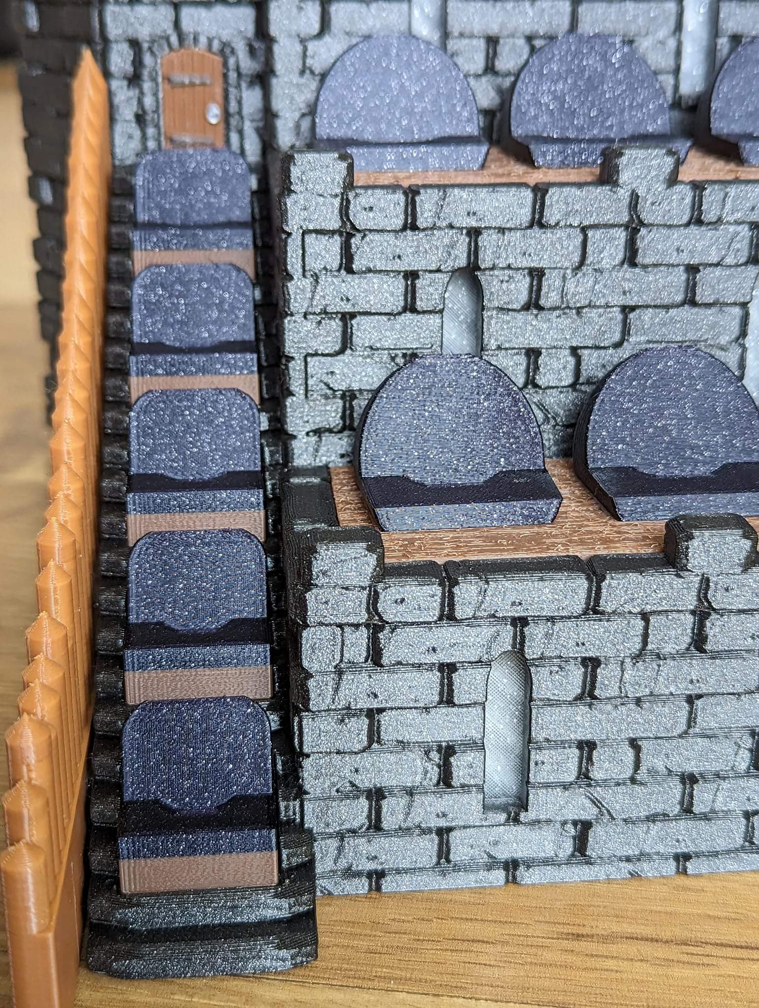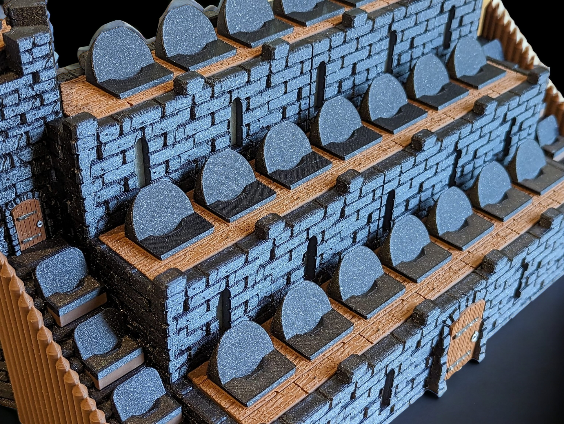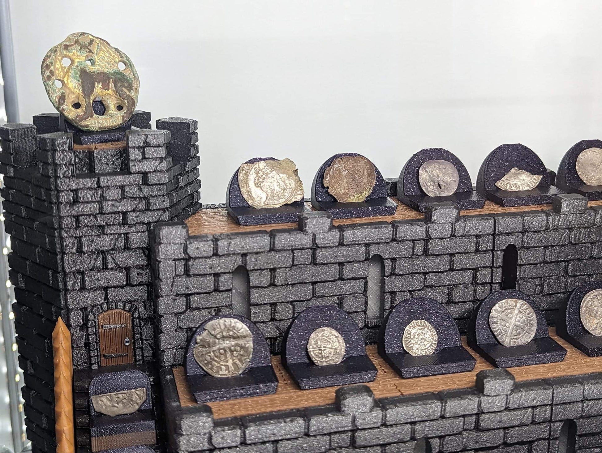 This display holds up to 20 coins on 3 shelves, with a wooden plank and grey sparkle coin stands. On each side, there are 10 coins on the steps and a stand on top of each turret, adding up to 32 coin stands in total.