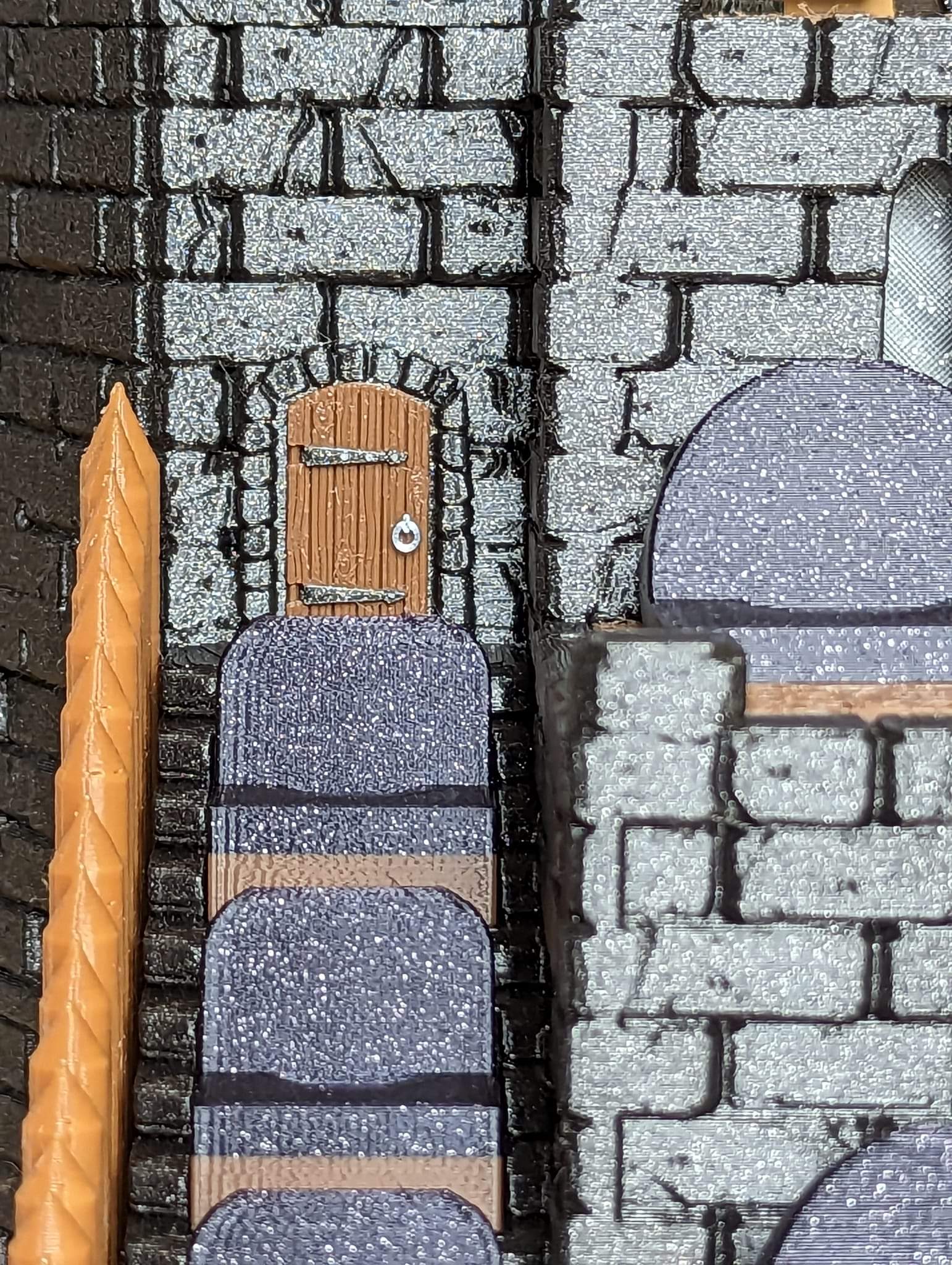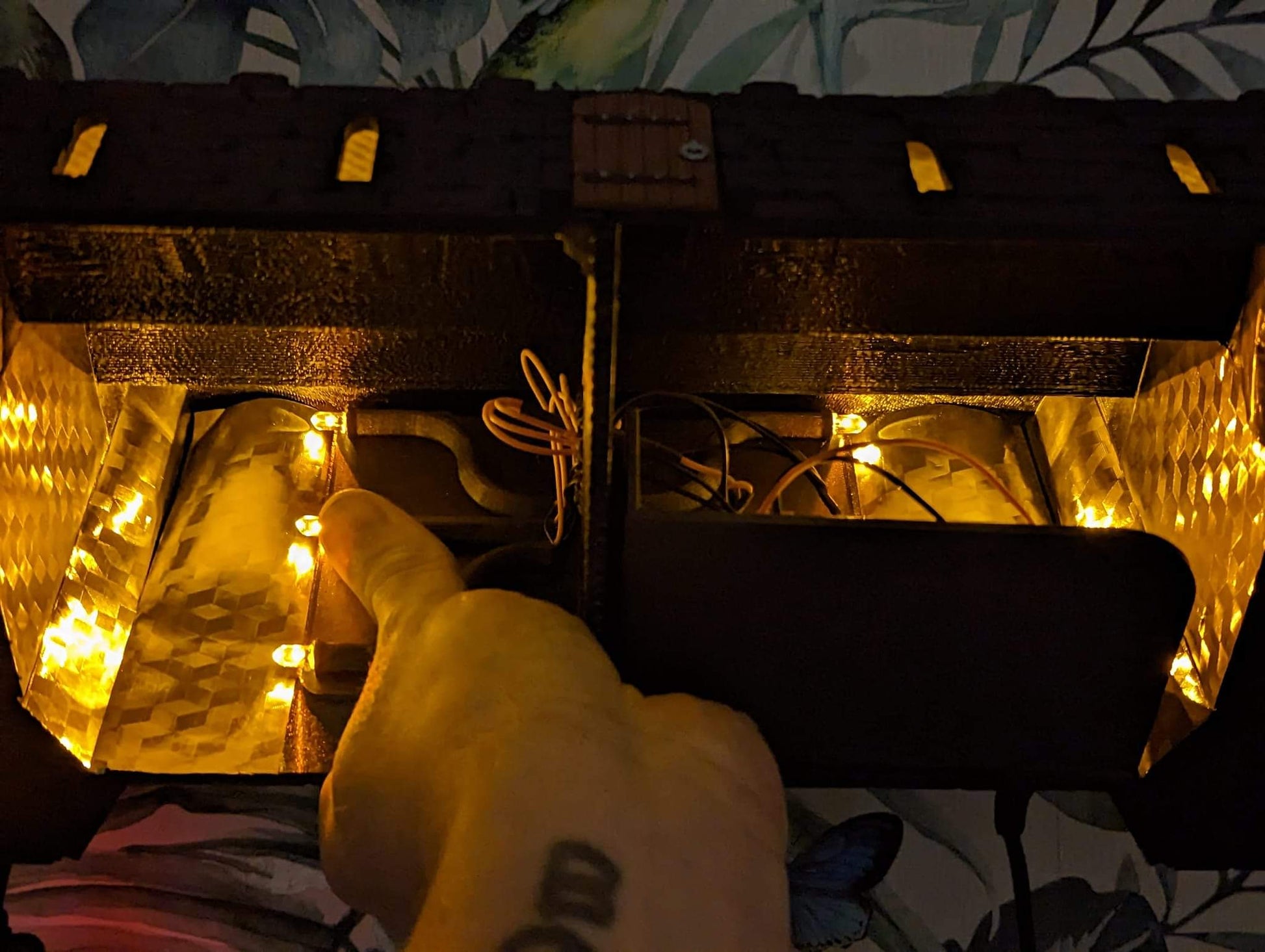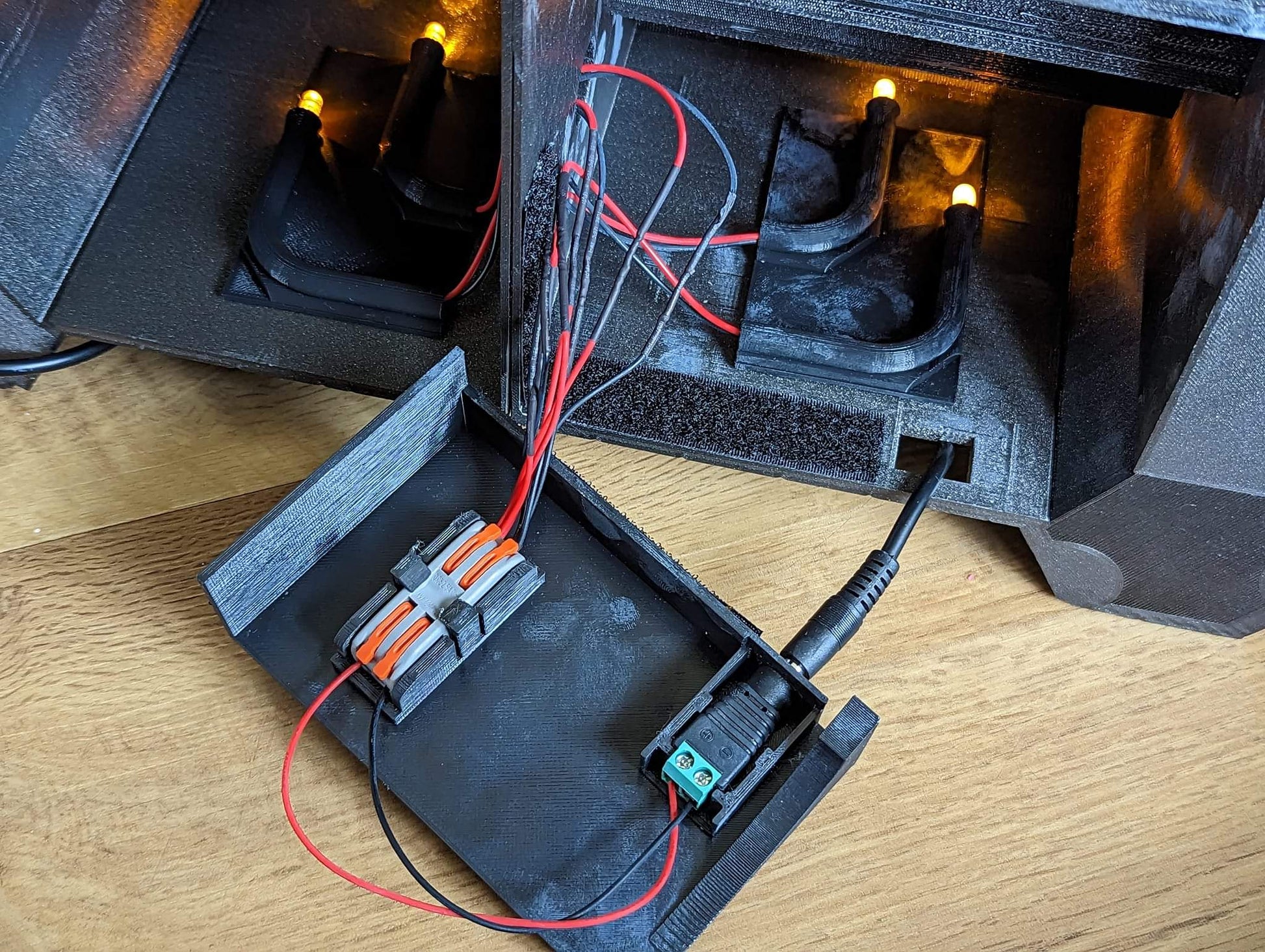 Printing takes over a week due to the individual parts and built-in LEDs. The internal design features custom-made channels for 6 flickering yellow LEDs (in the video) and custom housing power supply. Adhesive strips guarantee secure fastening, allowing for easy access to wiring, if necessary.