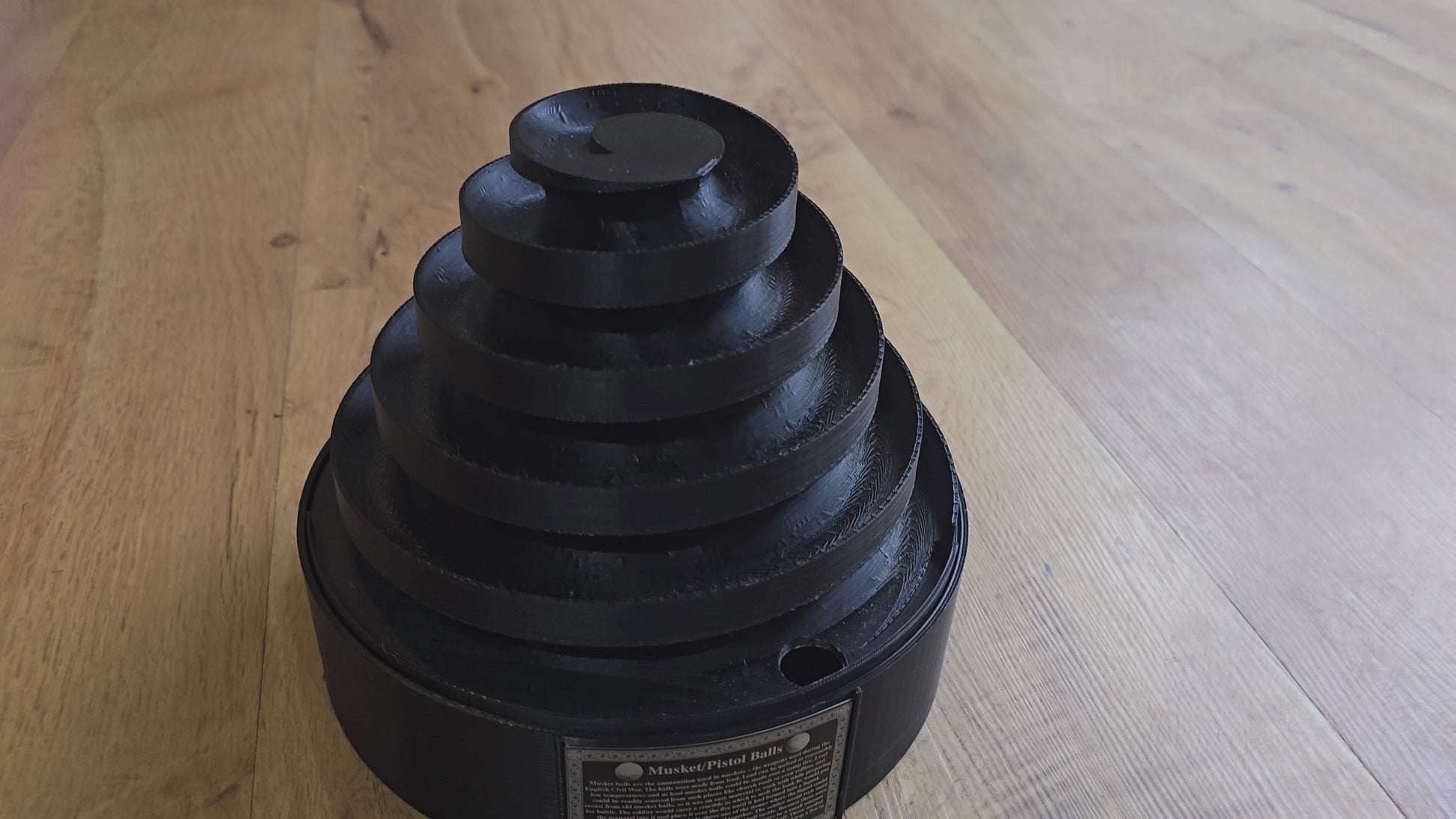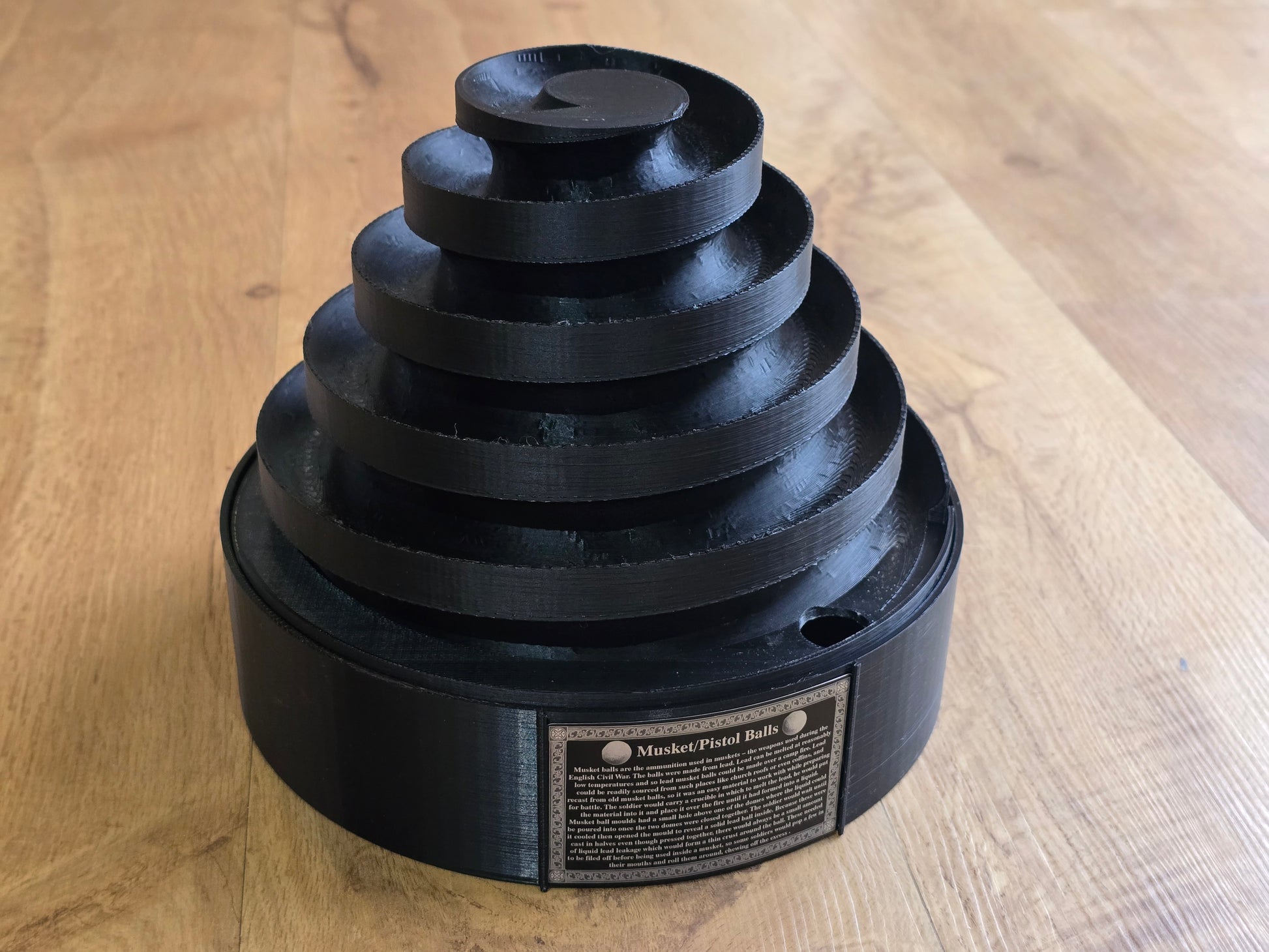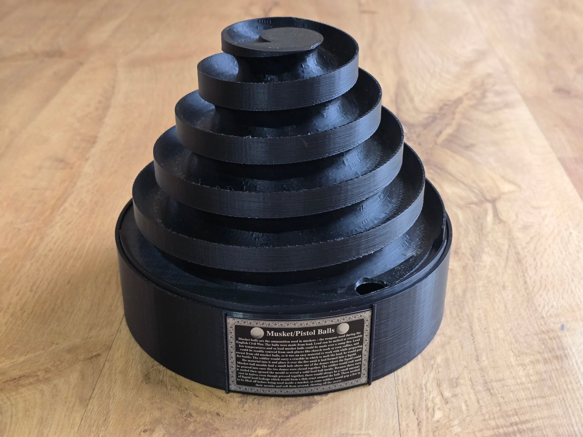 The display will allow musketball with a diameter of 20mm max to pass through the hole. Obviously balls over this size will not fit but can still be placed in the bin, and balls which are not entirely round will not roll down the chute.