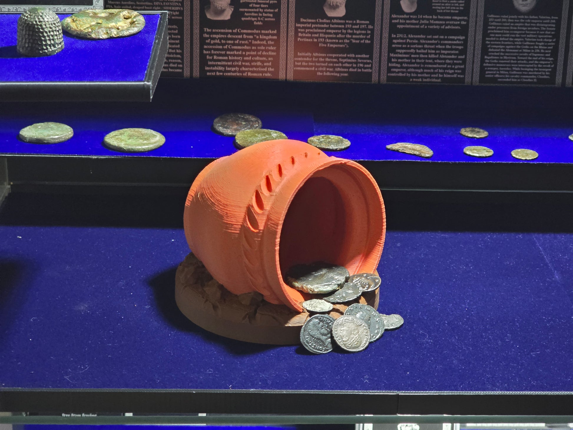Our matte orange terracotta PLA recreation of the famous Holy Grail cup is the perfect storage solution for your Roman Grots or any other coins in poor condition.