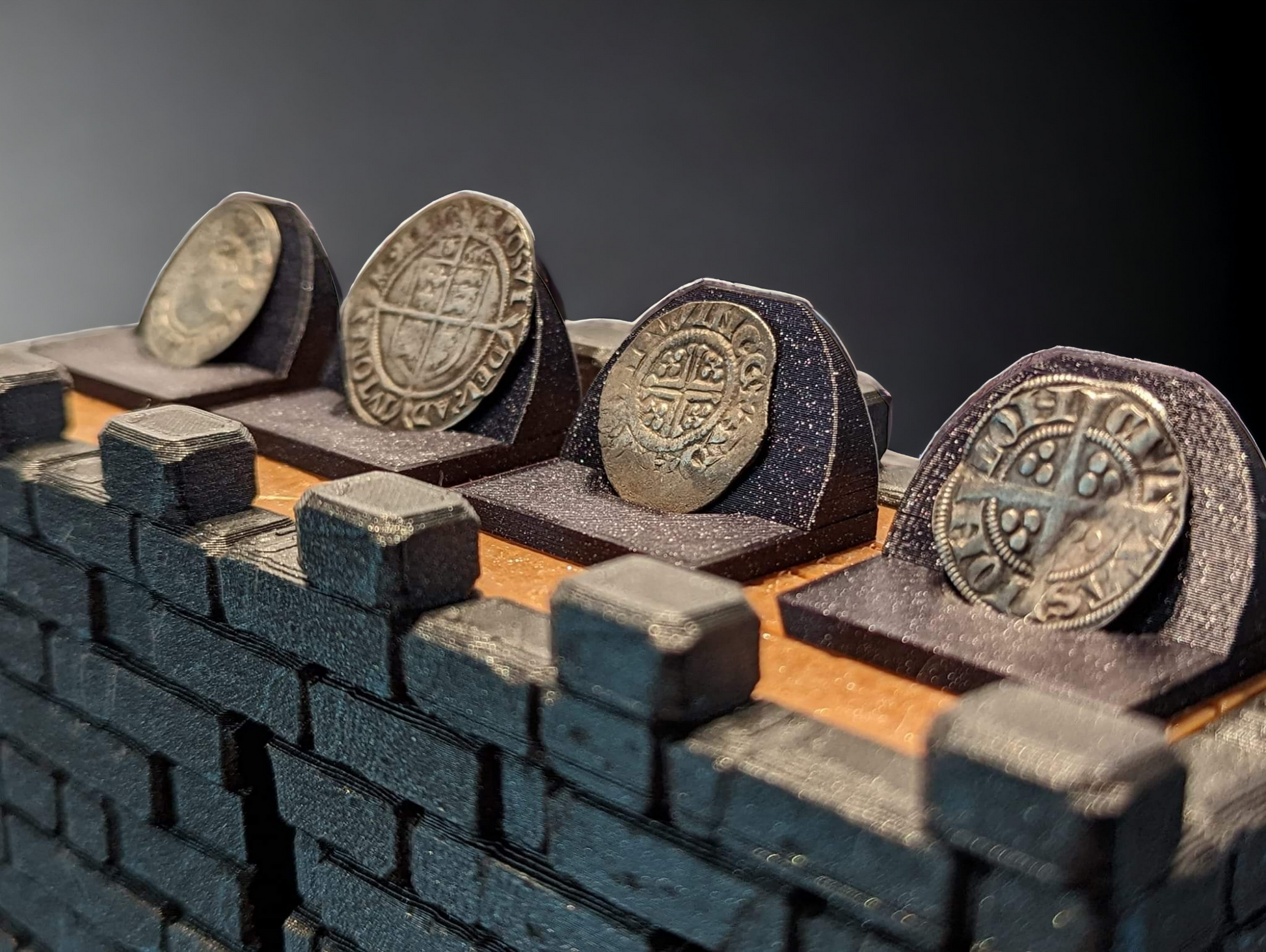 Measuring 157 x 58 x 63 these seat 4 coins of your choosing or small artifacts.