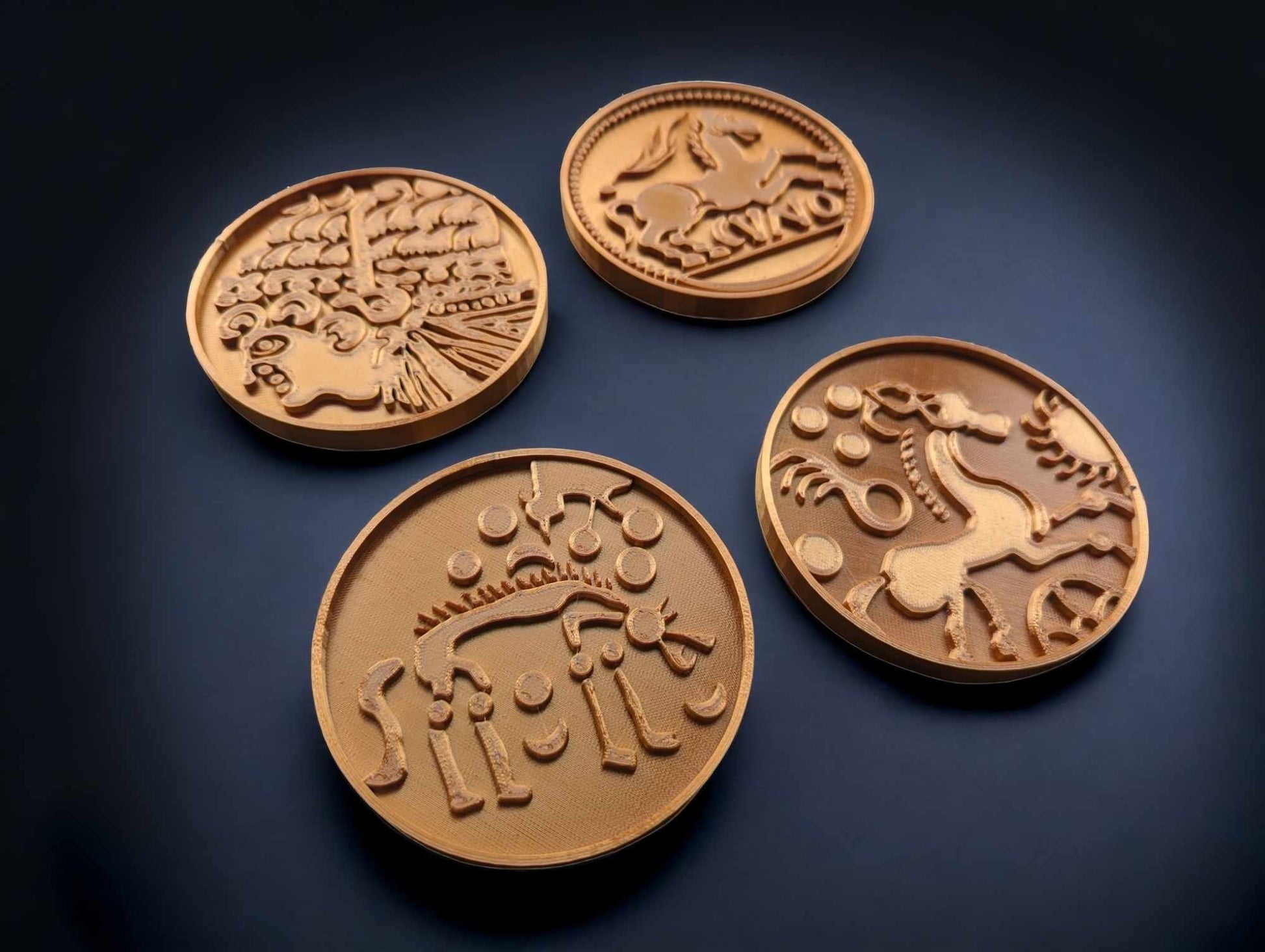 This stylish coaster set consists of 4 100mm diameter, 10mm thick, Celtic stater coins. 3D printed from silk gold PLA (Polylactic acid).