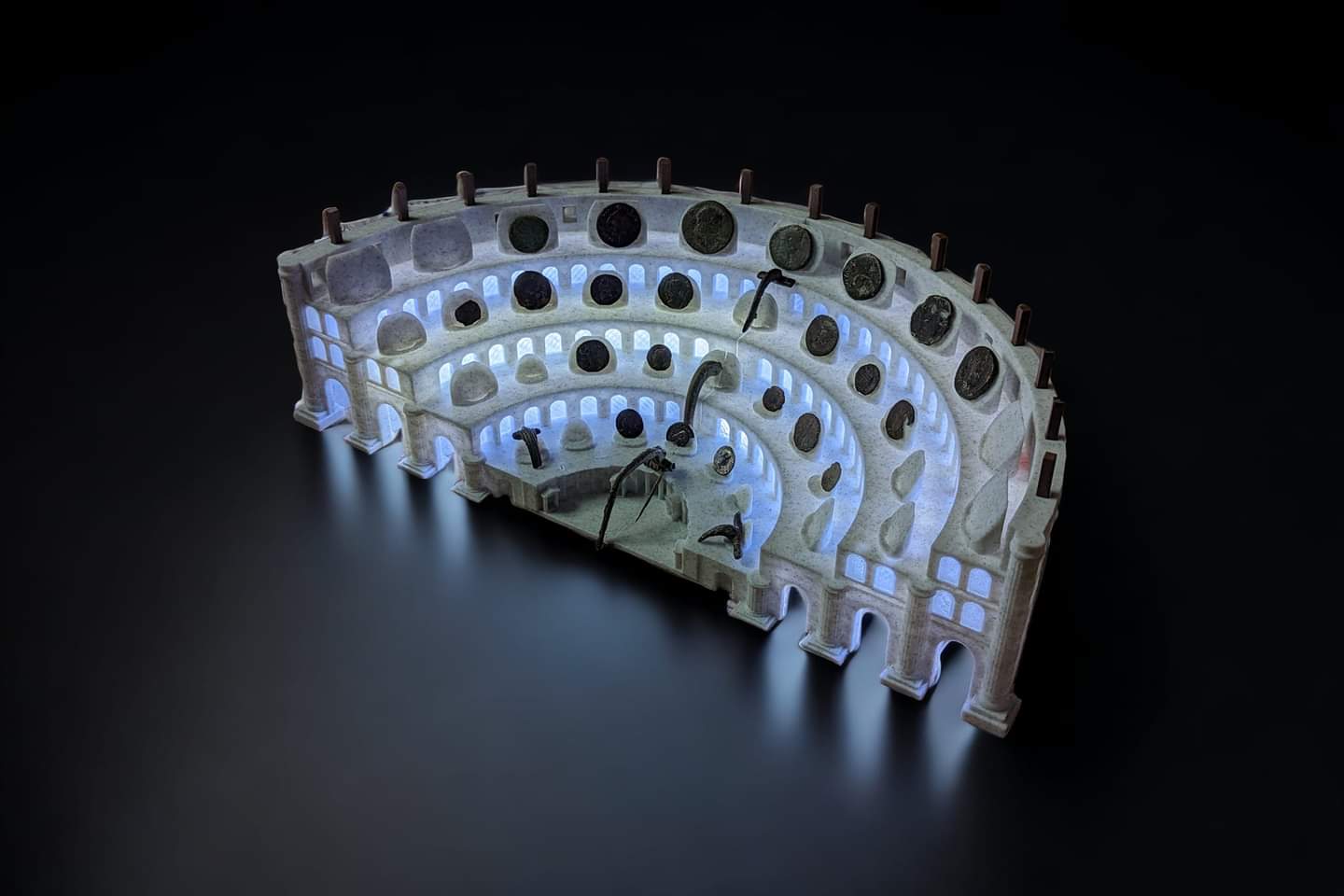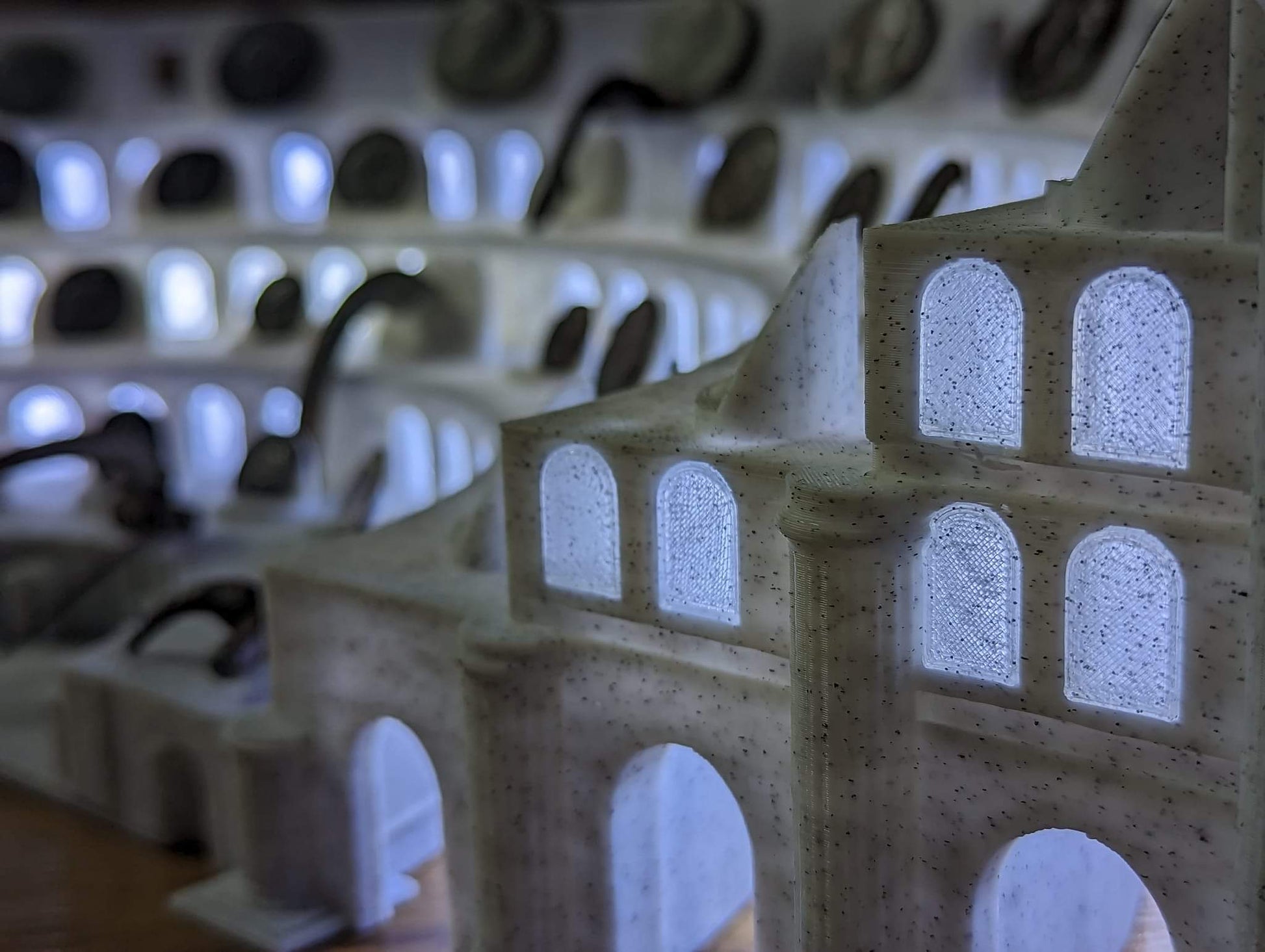 Powering the display is a 12v 3amp mains supply. For added effect, the top is embellished with "wooden" beams and it has space for 11 sesterius coins on the top tier, 11 large Roman coins on the next tier, 5 large and 4 small holders on the third tier, and room for 7 small Roman coins on the fourth tier.