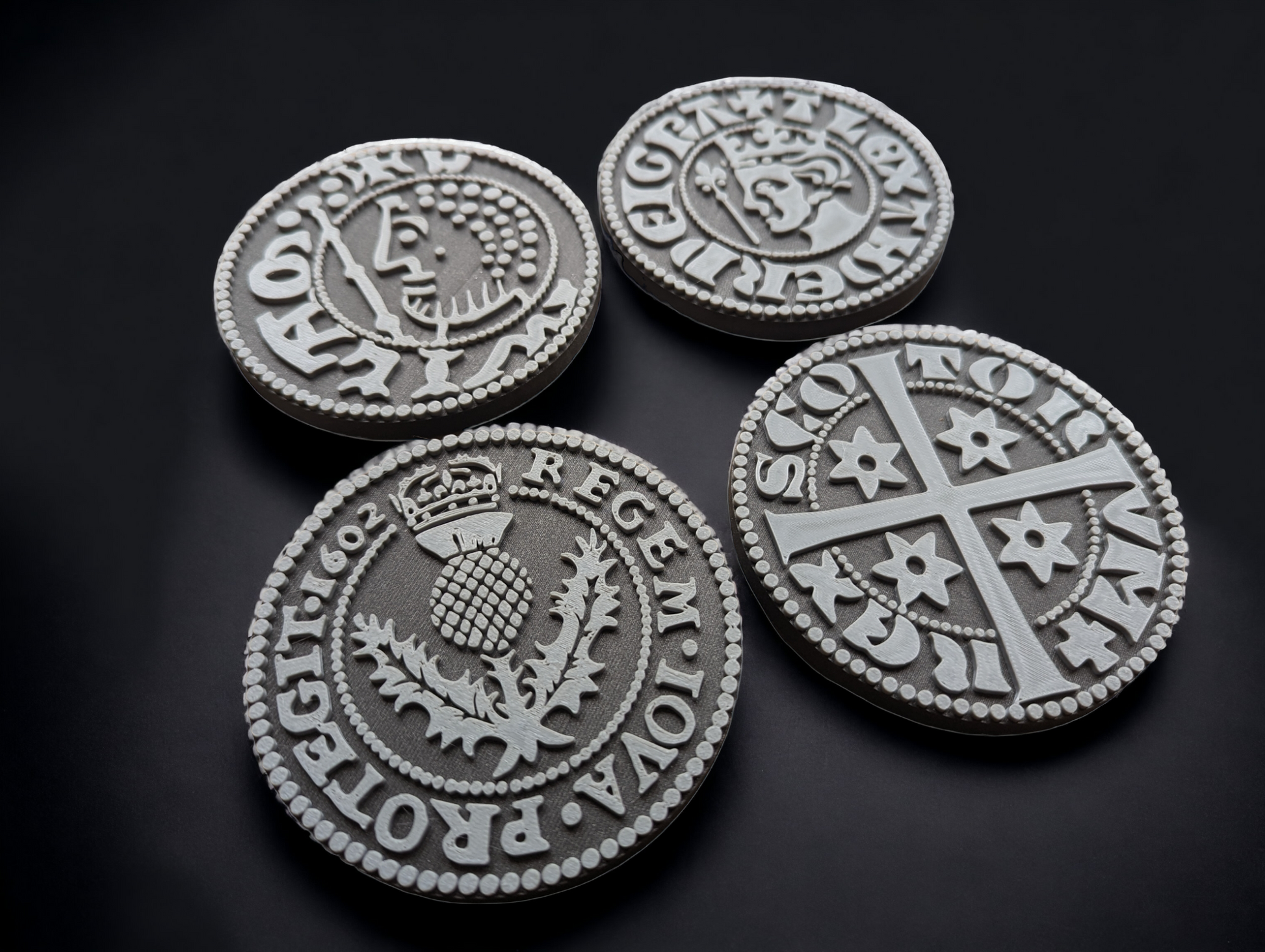 The Pride of Scotland Scottish Medieval Coaster Set features 4 Scottish hammered coin patterns, each measuring 100mm in diameter and 10mm thick.