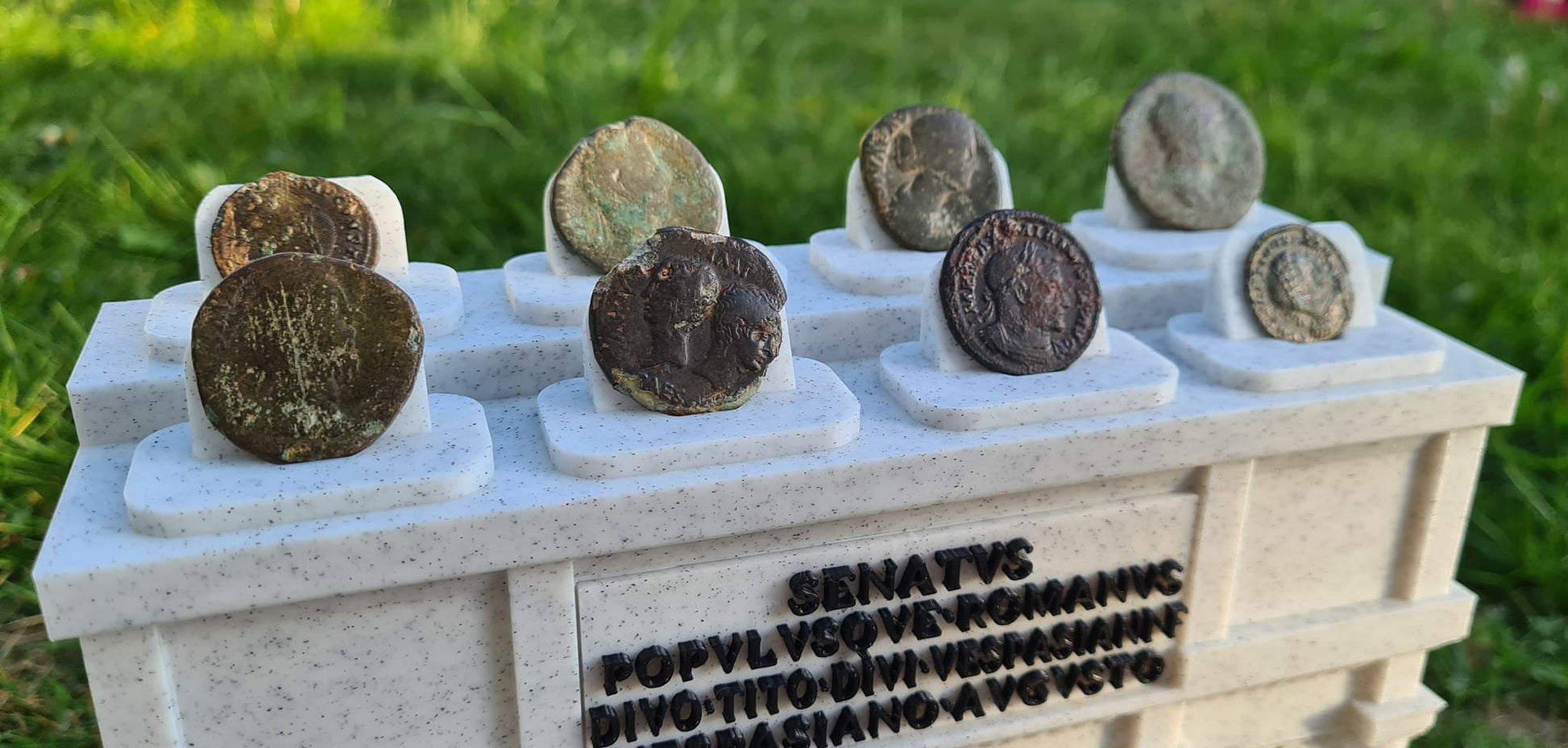 It provides room for 8 large Roman sestersius coins and four Roman fibula mounts down the sides of the arch.