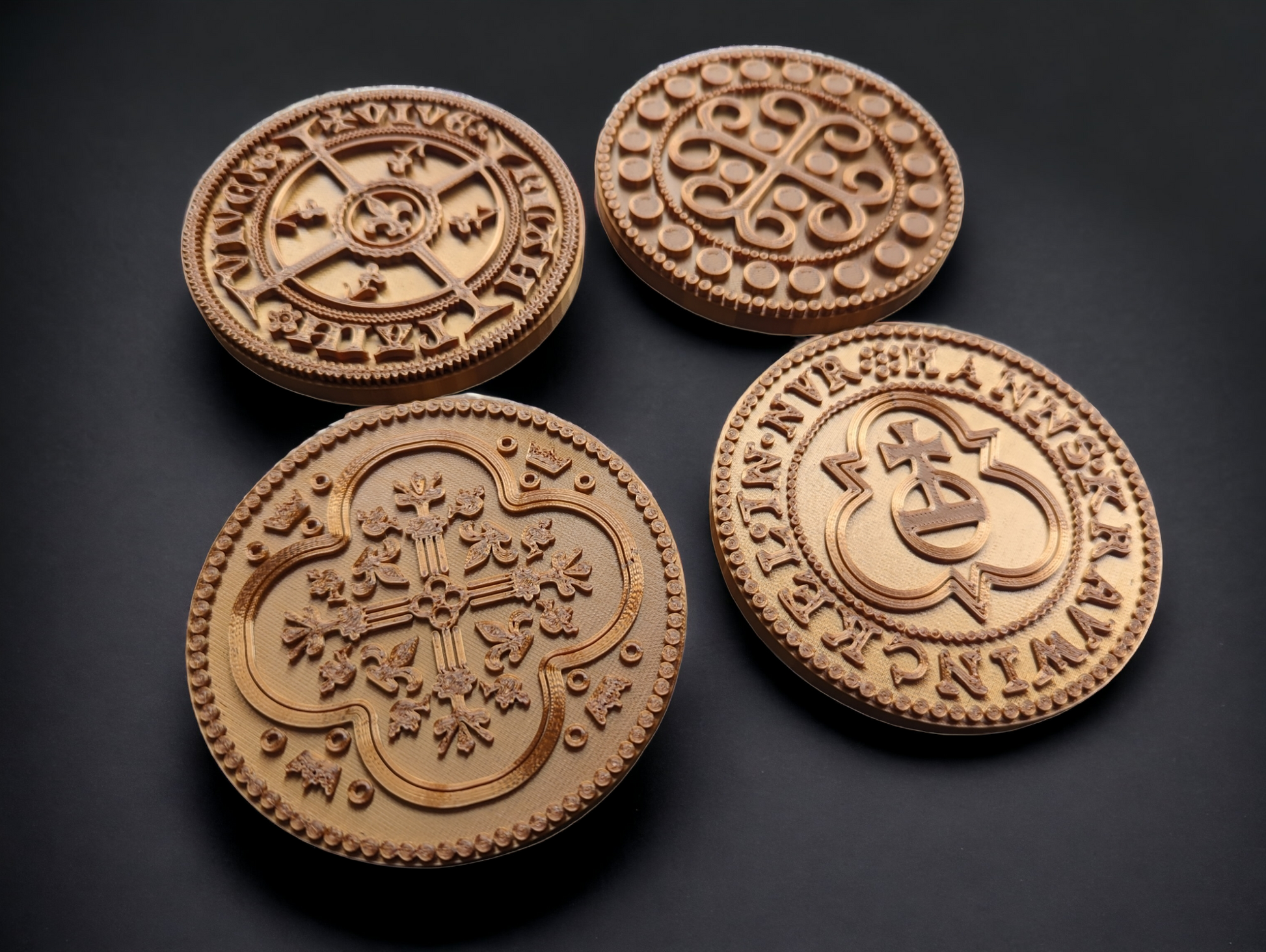 Each is 100mm diameter, 10mm thick piece is printed from rust copper PLA material and features a unique design including: